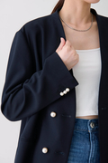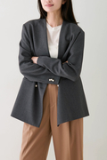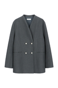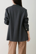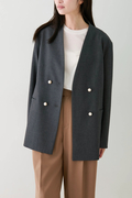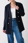 ノーカラーのシンプルなシルエットに、パール釦がアクセント。デニムやワイドパンツ、スカートと合わせてカジュアルに、ドレッシーなアイテムと合わせてフォーマルにとオンオフ問わず幅広いシーンで活躍します。素材はウール見えするT/R(ポリエステル、レーヨン混紡)素材を採用。程よい肉感でオールシーズンご着用いただける1枚です。