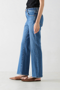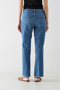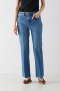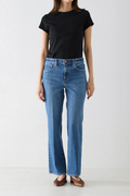 絶妙な裾幅でいつものスタイリングに合わせやすい、ストレートの延長のようなフレア感。センタープレス仕上げでトラウザーのような端正なフィットに仕上げています。ハリ・コシのあるふっくらした生地感があるクラボウのストレッチデニムを採用。染色は使用水量・薬剤・二酸化探査排出量を大幅に削減した坂本デニムによるエコ染色システムを採用。また、仕上げにシルクのような光沢をもたせる「シルケット加工」を施すことによって、生地表面をフラットにして、艶・光沢・ハリが生まれています。