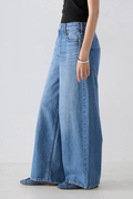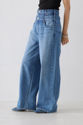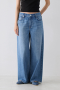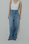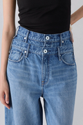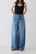 素材は25PFよりリニューアルしたupper hightsオリジナル素材を採用。より自然なヴィンテージ感の出る生地を目指して開発を重ね、古着らしいシボ感とタテ落ち感が特徴。ウエストハイライズ部分のベルトパーツは取り外し可能(7つのボタンで着脱)で、ミドルライズのパンツとしてもご着用いただける2WAY仕様。取り外したベルトパーツは、お手持ちのパンツやスカートにレイヤードしていただくくことも可能です。