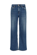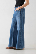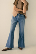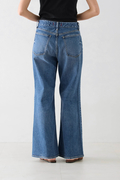 ウエストはミッドライズ仕様で、腰まわりをやさしく包み込みつつ、ラフすぎない絶妙なバランスに。トップスをインしてもアウトしてもバランスがとりやすく、さりげなく脚長効果も◎。ヒップや太ももには適度なゆとりを持たせつつ、裾にかけてほんのり広がるナチュラルなフレアシルエット。タイトすぎず、ワイドすぎず、どんなシューズとも好相性で、抜け感のあるスタイルを叶えてくれます。綿100%の見え方で、デニムらしいラフ感ある=シボ感強めのカイハラのストレッチデニム採用。