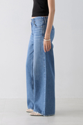 全体的にゆるっとしたシルエット&ミドルライズで今っぽく穿ける1枚に仕上がりました。素材は重厚感のあるシボ顔と相反して軽やかで柔らかいupper hightsオリジナル素材を採用。緯糸にオープンエンド糸を使用することで、肌に当たる面は清涼感のあるドライなタッチを実現しました。