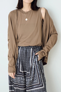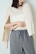 素材は繊細なシアー感が特徴の強撚天竺素材を使用。接触冷感機能も付いており、さらっとした肌離れの良い生地。その透け感は旬のレイヤードの着こなしも楽しめ、共布のカーディガンとのツインでも活躍します。
