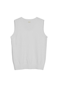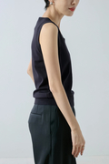 素材は鈍い光沢感が上品な印象を与えてくれる、柔らかな肌触りが特徴のハイゲージニット。同素材の2WAYカーディガンと合わせてセットアップで楽しめます。1枚でもインナーとしても着用できる、デコルテが綺麗に見えるノースリーブニットです。