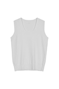 素材は鈍い光沢感が上品な印象を与えてくれる、柔らかな肌触りが特徴のハイゲージニット。同素材の2WAYカーディガンと合わせてセットアップで楽しめます。1枚でもインナーとしても着用できる、デコルテが綺麗に見えるノースリーブニットです。
