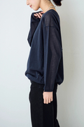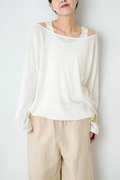 プルオーバーは程よいシアー感を持たせた編地で、見た目にも軽やか。デコルテを美しく見せるボートネックデザインとリラックスサイズが相まって、大人のリラクシー感を演出。セットのタンクトップは、シアーなプルオーバーのインナーとして、絶妙な透け感を活かすように設計しました。それぞれ単品でも活用でき、様々な着こなしが可能なアンサンブルニットです。