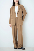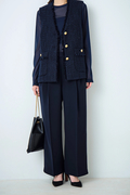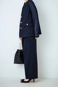 コンセプトの【Lustrous】は「光沢のある」「艶やかな」という意味。ダブルクロスの持つ生地の見た目の美しさや、エレガントな雰囲気をイメージしました。しなやかな落ち感と適度なハリ感が、ワイドシルエットでも着こなしを上品かつモードに昇華。深めの2タックが立体感をプラスし、シワになりにくいため長時間の着用でも美しさをキープ。セットアップはもちろん、単品でも主役級の存在感を放つ1着。