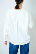 素材は縦のしわ感が特徴の、軽やかでしなやかな生地。控えめながらも上品な光沢と、肌に吸い付くような滑らかなテクスチャーが、歩くたびに優雅なドレープを描きます。デコルテを美しく見せる計算されたVネックラインは、顔周りをすっきりと見せ、アクセサリーとも好相性。テーパードパンツやタイトスカートにタックインすれば、上品なビジネススタイルに。ワイドパンツやデニムなどカジュアルなアイテム合わせでも、クラス感のある印象に引き上げてくれる1着です。