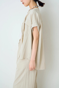 接触冷感があり、さらりとしたタッチのツイル素材を採用。素材特有の微光沢と適度なハリが、カジュアルすぎないきちんと感を演出。胸元に配したフラップ付きポケットが、シンプルな半袖デザインに程よいアクセントをプラス。同素材のパンツやスカートと合わせれば、セットアップ風のコーディネートも可能です。