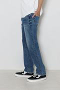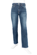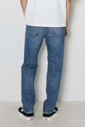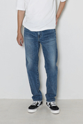 股上を少し長めに取り、ウエスト/ヒップ周りはジャストに設計。裾が広がって見えないようにワタリから裾にかけて緩やかにテーパードをかけました。素材は綿100%の見え方で、デニムらしいラフ感ある=シボ感強めのカイハラのストレッチデニムを採用。糸の打ち込み本数を多くして密度を上げることでメンズライクな硬めのデニム生地に仕上げています。経糸に3種類のムラ糸を組み合わせているため、加工後に自然とランダムなあたり感が出てきます。
