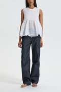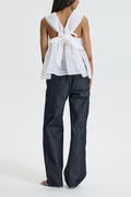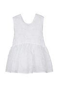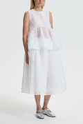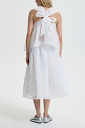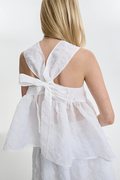 ベビードールシルエットがやわらかなペプラムへと広がり、高めのネックラインが肩まわりを上品に引き立てます。背面ではクロスリボンがボディを程よく引き締め、さりげなくロマンティックな余韻を添える、まさにセシリー・バンセンらしい仕上がりです。