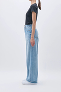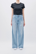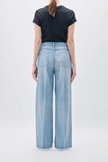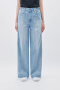 経糸にはスラブの短いムラ糸を用い、インディゴのみでロープ染色。澄んだ青味が印象的な中濃カラーが、クリーンで奥行きのある表情を生み出します。洗いをかけることで自然なシボ感が現れ、ほどよくラフでカジュアルなニュアンスに。夏のスタイリングに心地よく寄り添うデニムです。