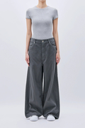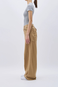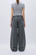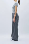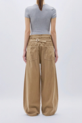 シルエットは内股の隙間が出来ないようにパターン改良したワイドパンツ。腰ばきでゆるっと足元をクッションさせたはき方、ヨーク部分に付いている尾錠を絞ってハイライズにするはき方の、2WAYでご着用いただけます。