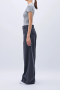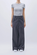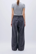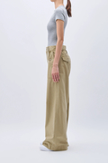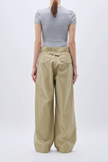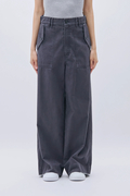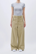 ミリタリーライクなバックサテン素材で仕立てた、太めのワイドストレートパンツ。ウエストをゆるっと落として腰ばきでも、後ろの尾錠をぐっと絞ってはいても可愛い1本です。