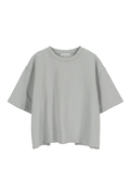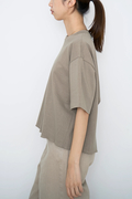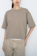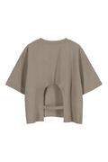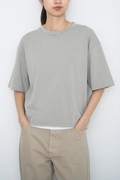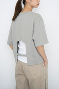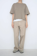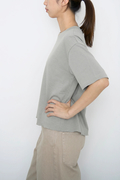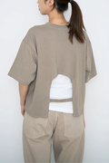 素材は天竺よりしっかり、裏毛より薄手の生地感で、ヴィンテージのような見た目ながらシャープで上品な印象の素材を採用。後ろ見頃のカッティングが特徴的で、着るだけで抜け感の出る1枚。