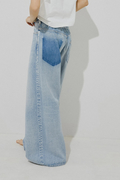 スーパーワイドレッグが特徴で、バックヨーク部分についたシンチバックでウエストの調整が可能。腰履きにしてルーズに履くのもおすすめ。素材はNEEDBYオリジナル開発生地。横糸にオープンエンド糸を使用し、染色にはi-Nextという方法を採用。サステイナブルなものづくりを意識して開発しました。本格的なセルビッチ仕様で、しっかりとした生地感ですが軽いのが特徴です。