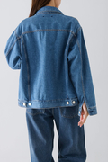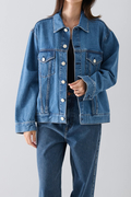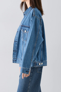 素材はNEEDBYオリジナルデニム地採用。横糸にオープンエンド糸を使用。染色にはi-Nextという方法を採用し、サステイナブルなものづくりを意識し開発をしました。様々なコスト(加工コスト、エネルギー、製作コストなど)を抑えながらもNEEDBYらしい加工感が表現できるよう試作を重ね、メイドインジャパンならではのヴィンテージ感のある生地に仕上がりました。ジャストサイズで着ても、1サイズ大きめに着てもかわいい1枚。