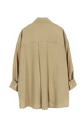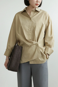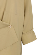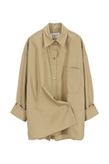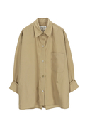 リラックスフィットにアシンメトリーなフロントボタンが特徴。胸元のパッチポケット、バックヨーク、背面のボックスプリーツ、そしてシグネチャーのシングルロールボタンカフスを備えています。