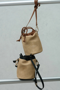ラフィア×レザーの巾着型のバッグ。取り外し、調整可能なショルダーストラップ付属。