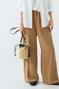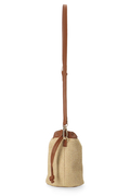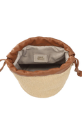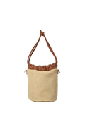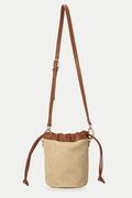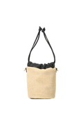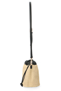 ラフィア×レザーの巾着型のバッグ。取り外し、調整可能なショルダーストラップ付属。