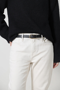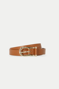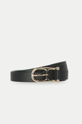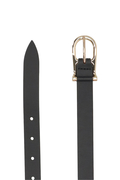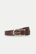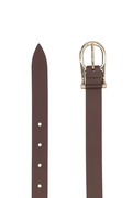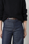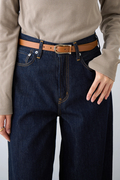 華奢なバックルが上品なレザーベルト。どんなスタイルにもマッチする使い勝手のいいベルトです。