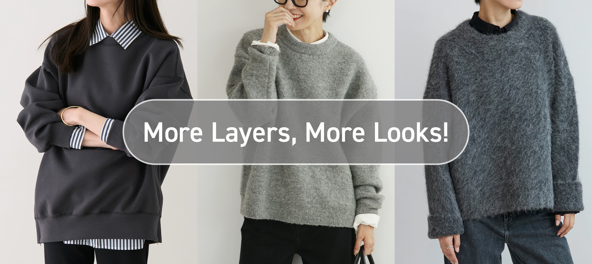 スウェット×ニット×シャツやタートルのレーヤードで、