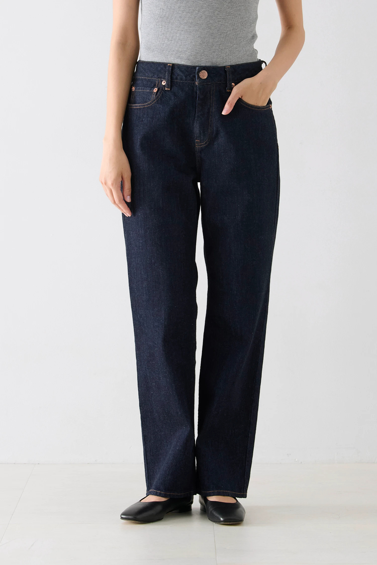 脚のラインを拾いすぎないナチュラルなストレートで細すぎず太すぎず、絶妙なボリューム感が、力の抜けた大人のデニムスタイルを演出してくれます。