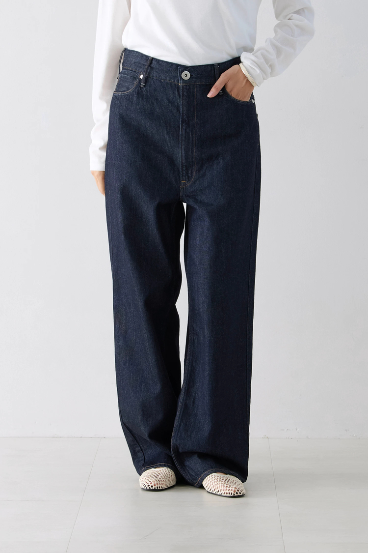 安心感のある穿き心地と、美しい腰まわりのラインを両立。太もも部分からゆったりとワイドに広がり、裾までストンと落ちるストレートレッグが特徴です。