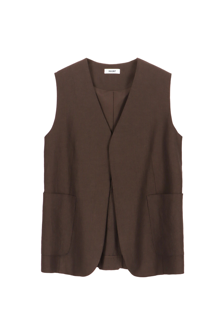 両サイドのパッチポケット、シルエットを調節できる背中のベルトなど、シンプルなデザインながら機能性も兼ね備えたジレ。