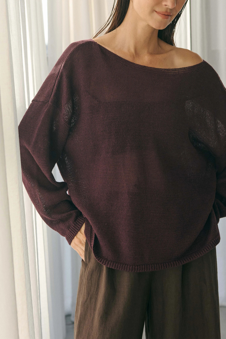 前後2wayで着られるリネン100%のプルオーバーニット。ボートネックでのレイヤードは、重ねた色をさり気なく楽しめます。